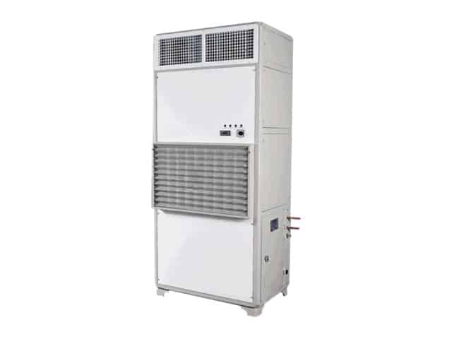 - Повітряний конденсатор. Виготовлений з мідних труб, покритих алюмінієвими ребрами. Мідні труби розширені спеціальним методом для забезпечення високої ефективності передачі тепла алюмінієвих ребер. Для циркуляції повітря в повітряних конденсаторах встановлюються осьові вентилятори.