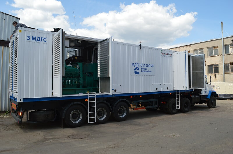 - Cummins C1100D5B, змонтована в 40-футовий шумозахищений всепогодний контейнер, на базі причепа МАЗ та тягача КРАЗ (ЗАЕС) підвищеної прохідності
