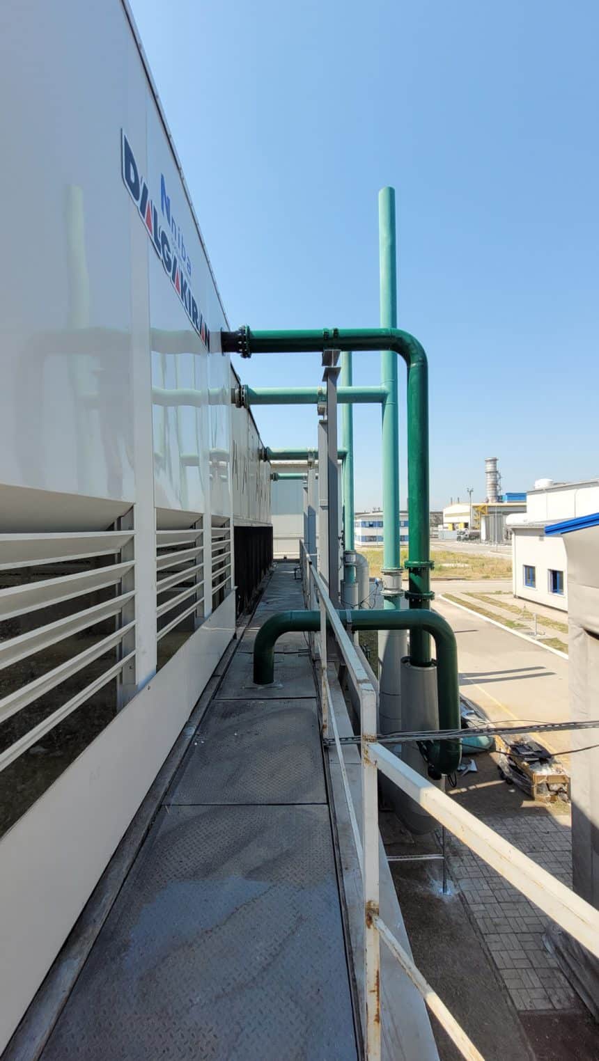 Фахівцями компанії «Далгакиран компресор Україна» було виконано повний комплекс робіт «під ключ» – від обстеження існуючого обладнання на підприємстві, підбору і поставки до монтажу та пуско-налагоджування вентиляторної градирні NIBA (виробництво Туреччина), яку було інтегровано в існуючу систему охолодження основного технологічного обладнання.