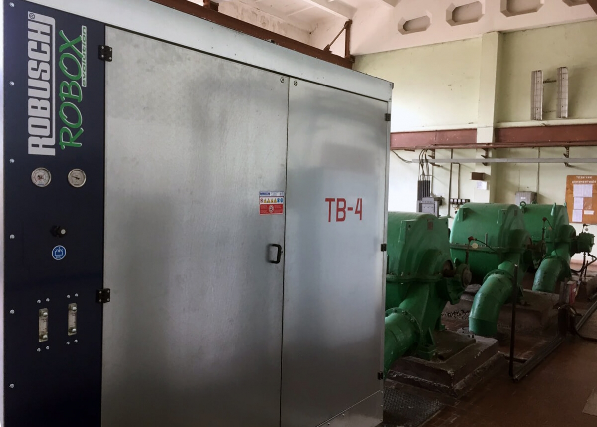 Згідно з проектом модернізації, була проведена заміна однієї із застарілих енерговитратних повітродувок на сучасну повітродувку Robuschi ES 126/5P (вир-во Італія) продуктивністю 6183 м3/год при тиску 0.4 бар(н). Дане обладнання оснащене енергоефективним двигуном ABB потужністю 110 кВт (клас енергоефективності IE3), що вигідно відрізняє його від аналогів з більш високим енергоспоживанням і аналогічними показниками по продуктивності, потужності і тиску.