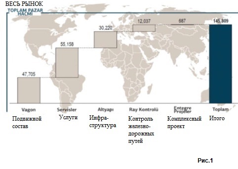 На рис. 1. Структура ринку залізничних поставок (млн. євро)Ресурс: Дослідження Світового залізничного ринку 2012 UNIFE (Європейська Асоціація Виробників Залізничної Техніки).