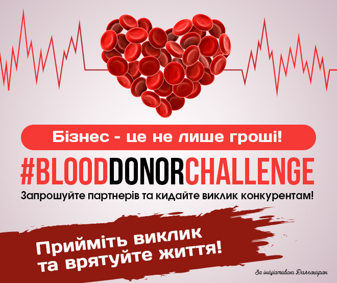 Запрошуємо взяти участь у благодійній акції #BloodDonorChallenge. Умови акції прості – ви приймаєте виклик, здаєте донорську кров та кидаєте виклик вашим конкурентам і запрошуєте партнерів (мінімум 3 компанії).