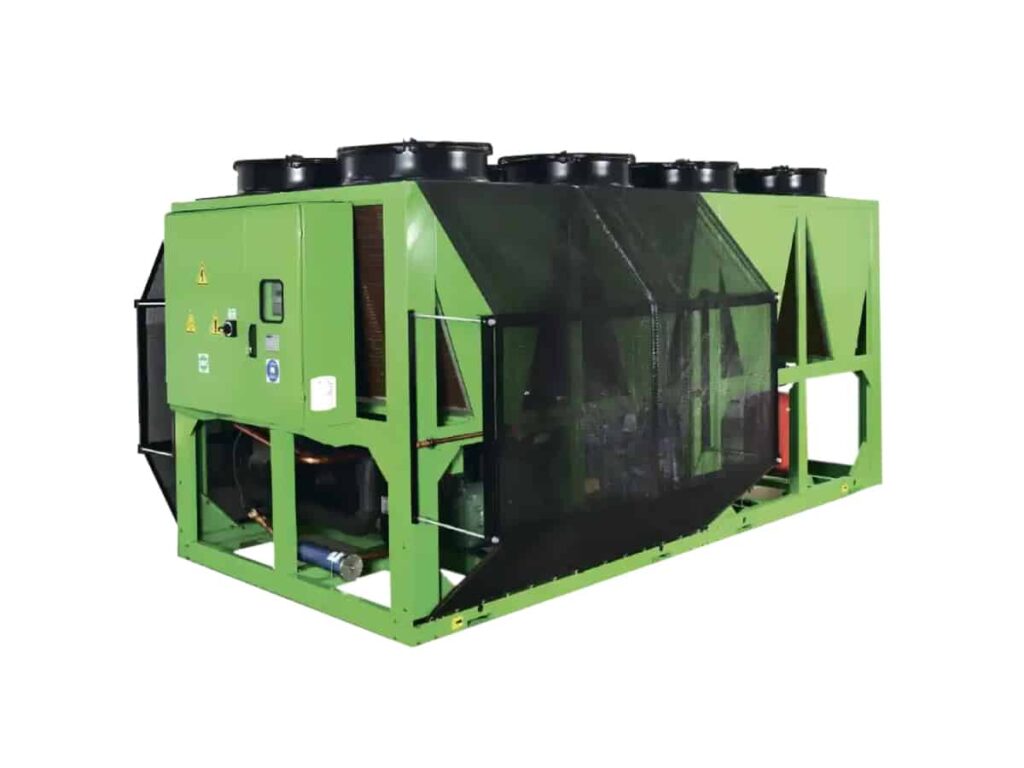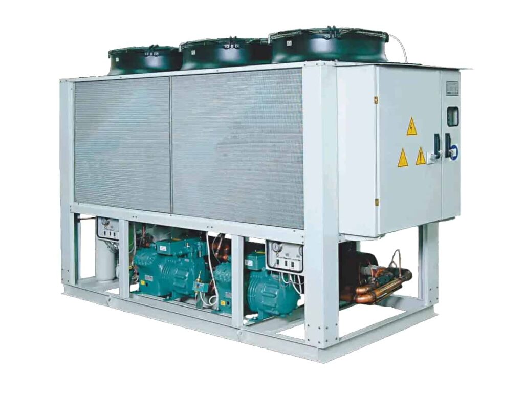 - Повітряні чилери. Прості у встановленні, без градирні, добре підходять для середніх навантажень. За спекотної погоди потребують коректної вентиляції об’єкта. Перевага — швидкий запуск і гнучкий вибір за габаритами.