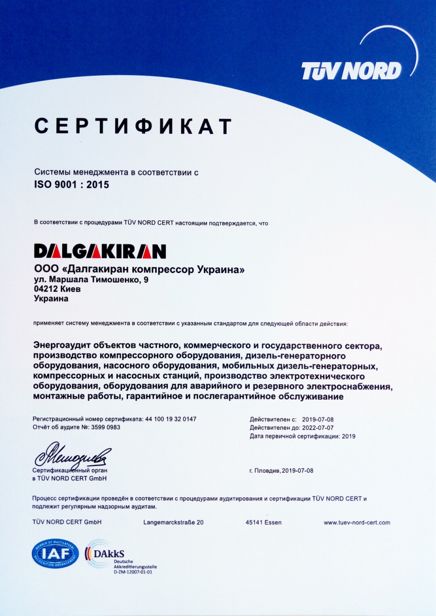 Відповідно до процедур TÜV NORD CERT отриманим сертифікатом підтверджується, що ТОВ “Далгакиран компресор Україна” застосовує систему менеджменту ISO 9001:2015 для наступних напрямків діяльності: