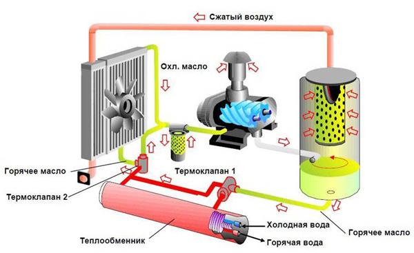 Відповідно до теорії 94% енергії при стисненні повітря компресорами перетворюється в тепло. Тому найбільш ефективним рішенням для промисловості є проектування та розміщення компресорів спільно з котельнями з метою використання енергії від компресорів. Використання теплової енергії безпосередньо від вентиляторів повітряного охолодження компресорів виявляється малоефективним. Навіть на невеликій відстані повітряний потік з температурою 50- 60 ° С розсіюється і охолоджується поблизу компресорного приміщення. Таке рішення годиться для обігріву приміщень в безпосередній близькості від компресорів, а при віддаленості навіть в 5 м температура повітря опускається до 30 ºС і подальше примусове транспортування його втрачає будь-який сенс. Взимку охолодження відбувається ще стрімкіше. Іншими словами, в цьому випадку замовник отримує джерело низькопотенційної теплової енергії з обмеженими можливостями застосування. Рішенням стає застосування спеціальної системи рекуперації, розробленої виробником і вбудованої в корпус компресора. В основі якої – теплообмінник вода / вода. У ньому компресорне масло, нагріте до температури 90-100 ºС, нагріває потік води до температур 60-90 ºС (в залежності від інтенсивності потоку). Нагріту воду можна легко транспортувати, накопичувати або направляти в зворотний контур системи гарячого водопостачання підприємства.